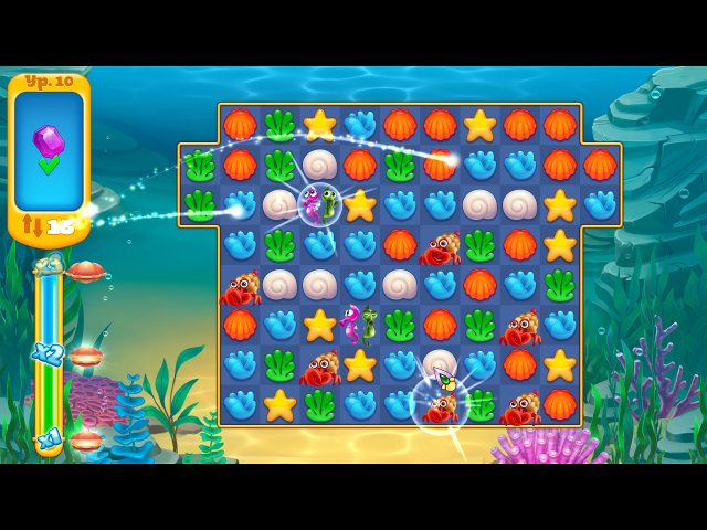 Магическая сила Трезубца Посейдона, который Трито взял с собой, поможет преодолеть любые трудности, но ее нужно подпитывать. Для этого переходите на игровое поле, составляйте цепочки из одинаковых фишек, выполняйте задачи уровня за определенное количество ходов и зарабатывайте очки и магические кристаллы! Остались ходы? Отлично, они принесут дополнительные очки.