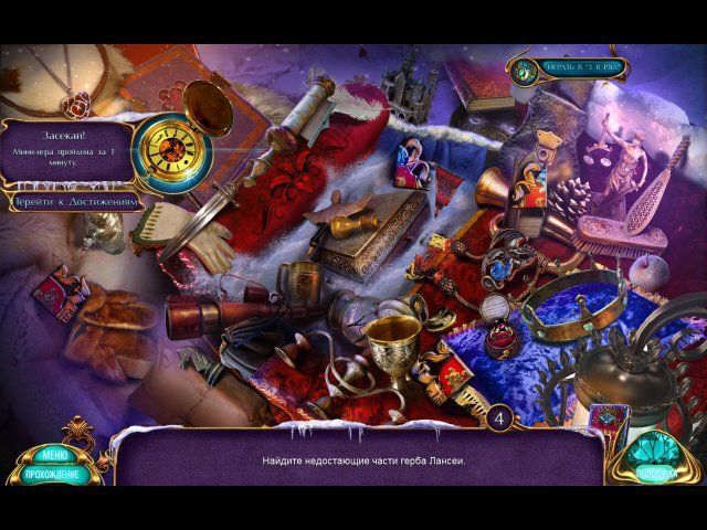 Все успехи будут отмечены наградами. Например, "Уильям Добрый" — вы покормили кролика, "Магия меня оберегает!" — победили волка, "Искусный алхимик" — расколдовали обсидиановых воинов, "Близкое наблюдение" — без подсказки прошли СПП, "Следуй за тенями" — завершили 3 СПП, и каждую — за 2 минуты или меньше, "Коллекционер" — отыскали 100 предметов, "В яблочко!" — обошлись без случайных кликов на СПП, "Альтернативная история" — прошли игру "Три в ряд", "Засекай!" — закончили мини-игру за минуту, "Мастер логики" — не пропустили 10 мини-игр. Удачи!