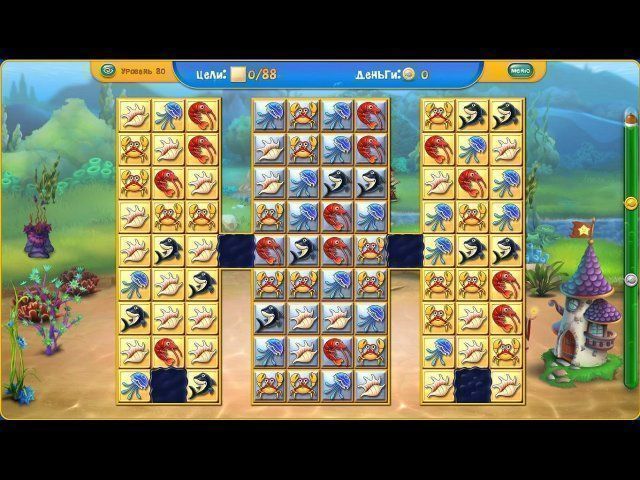 Чтобы создать собственный, неповторимый подводный мир, вам нужно заработать денег на игровом поле. Составляйте линии из одинаковых фигурок, разбивайте плитки под фишками и не забывайте, что время прохождения уровня ограничено. С помощью бонусов у вас получится действовать без промедления. "Молния" убирает с поля все фишки одного типа, а "Бомба" взрывает все в радиусе двух клеток. Один щелчок мыши, и ситуация на игровом поле изменится в вашу пользу. А за неиспользованное время вы непременно получите дополнительные очки.