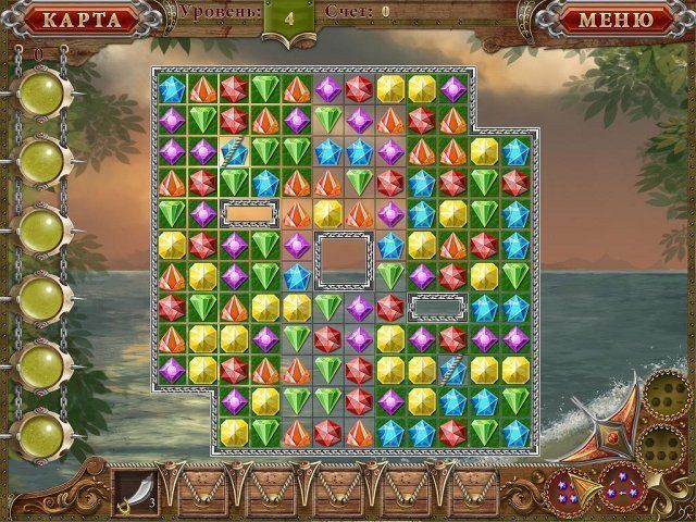 Кроме того, часть ячеек заблокирована веревками. Чтобы избавиться от них, необходимо объединить их с такими же фишками. Периодически на поле будут появляться сверкающие драгоценные камни. Включая их в ряды, группы или цепочки, вы получаете шанс заработать полезные бонусы, которые позволят вам быстрее справиться с заданием и перейти на следующий уровень. Например, нож поможет выбить одну любую фишку, взрывчатка — любую фишку вместе с соседней с ней, а арбалет уничтожит целый ряд фишек.